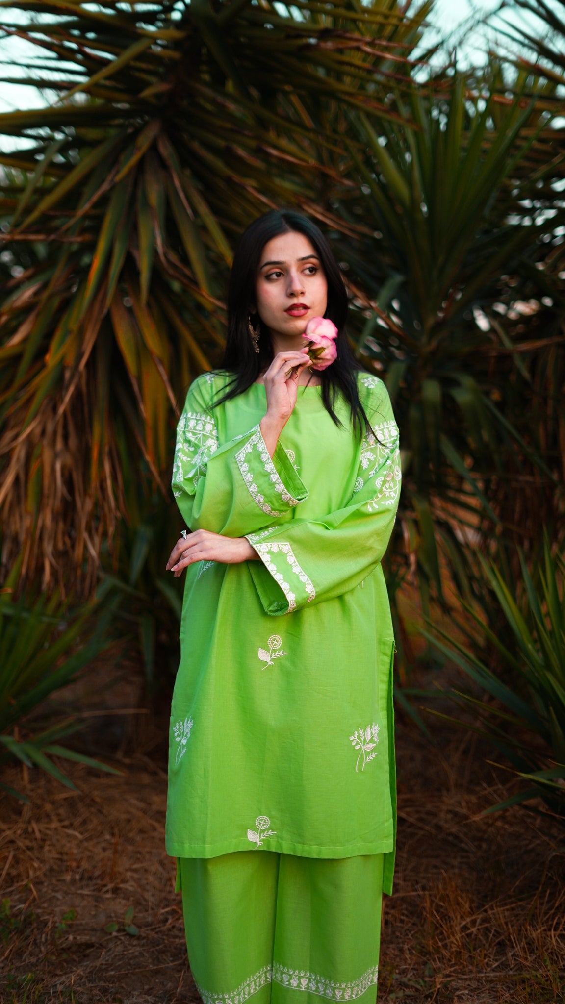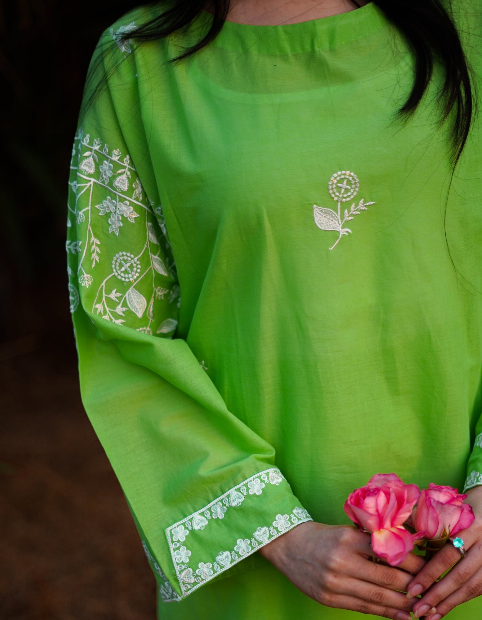 Step into elegance with SEQUENCES, a beautifully crafted 2-piece embroidered lawn ensemble in a vibrant green color. The shirt is adorned with intricate sequence embroidery, adding a touch of glamour and sophistication. Paired with matching embroidered trousers, this outfit is a perfect blend of traditional charm and contemporary flair, designed to make you stand out at any occasion.